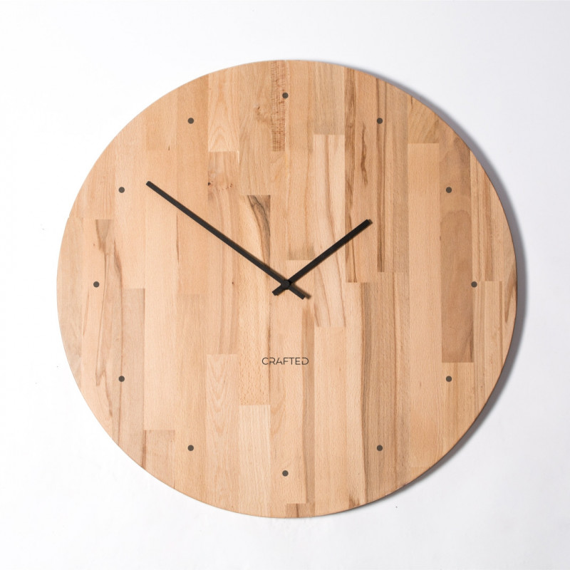 Dřevěné hodiny z bukového dřeva mají průměr 60 cm. Hodiny mají černé ručičky a ciferník je gravírovaný a tvoří jej dvanáct černých teček, které nahrazují číslice. Svým jednoduchým vzhledem budou moderním a vkusným doplňkem vašeho interiéru.