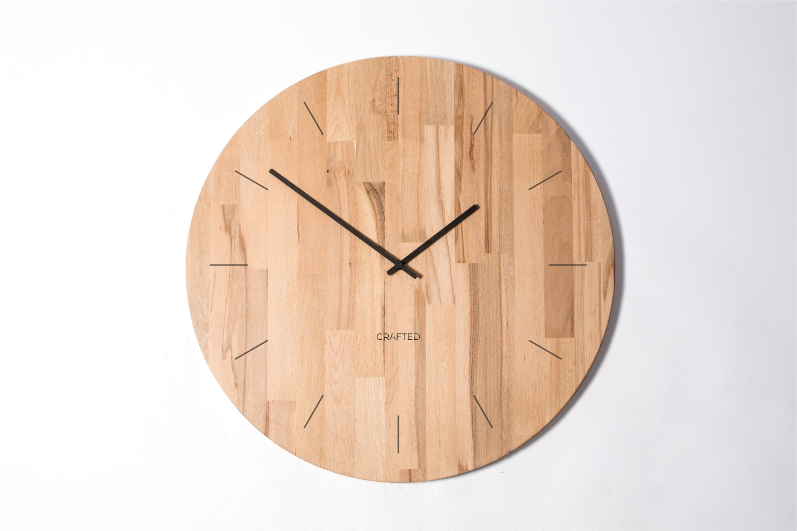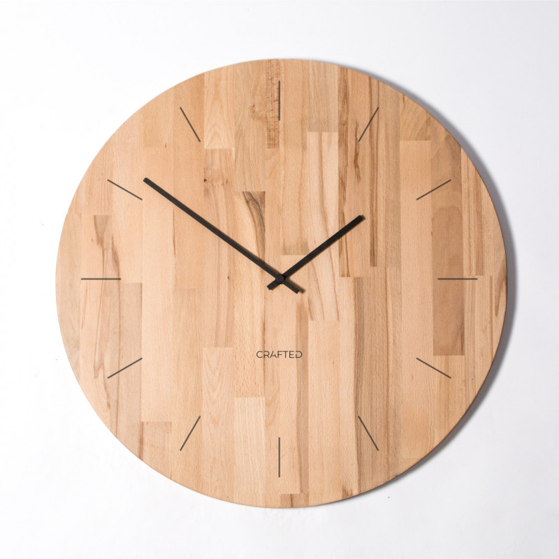 Dřevěné hodiny z bukového dřeva mají průměr 60 cm. Hodiny mají černé ručičky a ciferník, který je vygravírovaný v podobě dvanácti krátkých čar nahrazujících číslice. Hodiny tak poskytují rychlý přehled o čase. Svým jednoduchým vzhledem budou moderním a vkusným doplňkem vašeho interiéru.