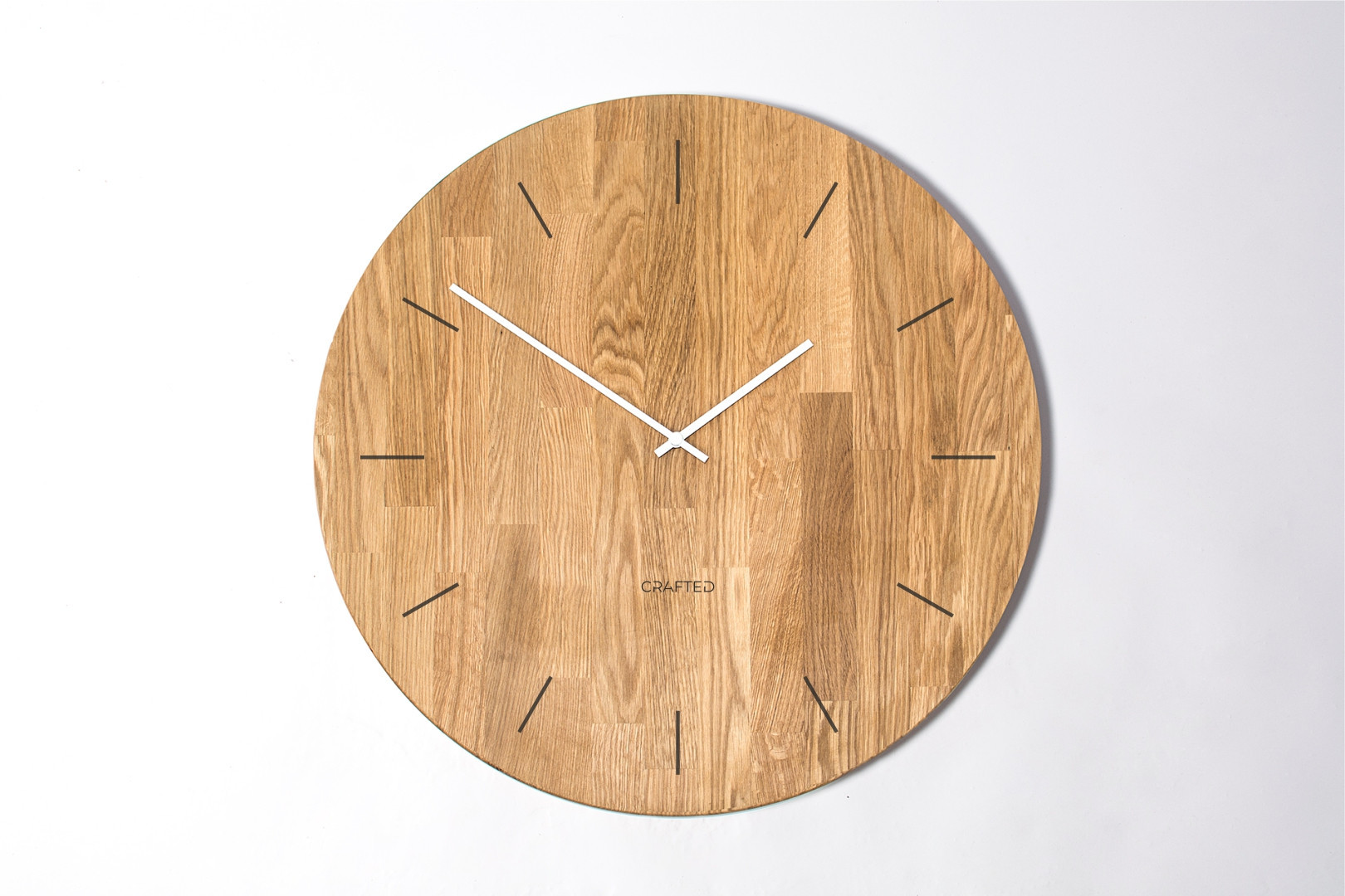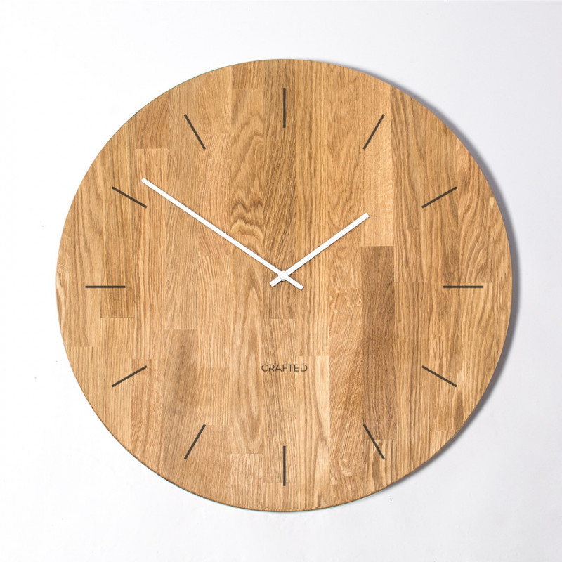 Dřevěné hodiny z dubového dřeva mají průměr 60 cm. Hodiny mají bílé ručičky a ciferník, který je vygravírovaný v podobě dvanácti krátkých čar nahrazujících číslice. Svým jednoduchým vzhledem budou moderním a vkusným doplňkem vašeho interiéru.