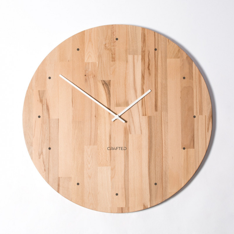 Dřevěné hodiny z bukového dřeva mají průměr 60 cm. Hodiny mají bílé ručičky a ciferník je gravírovaný a tvoří jej dvanáct černých teček, které nahrazují číslice. Svým jednoduchým vzhledem budou moderním a vkusným doplňkem vašeho interiéru.