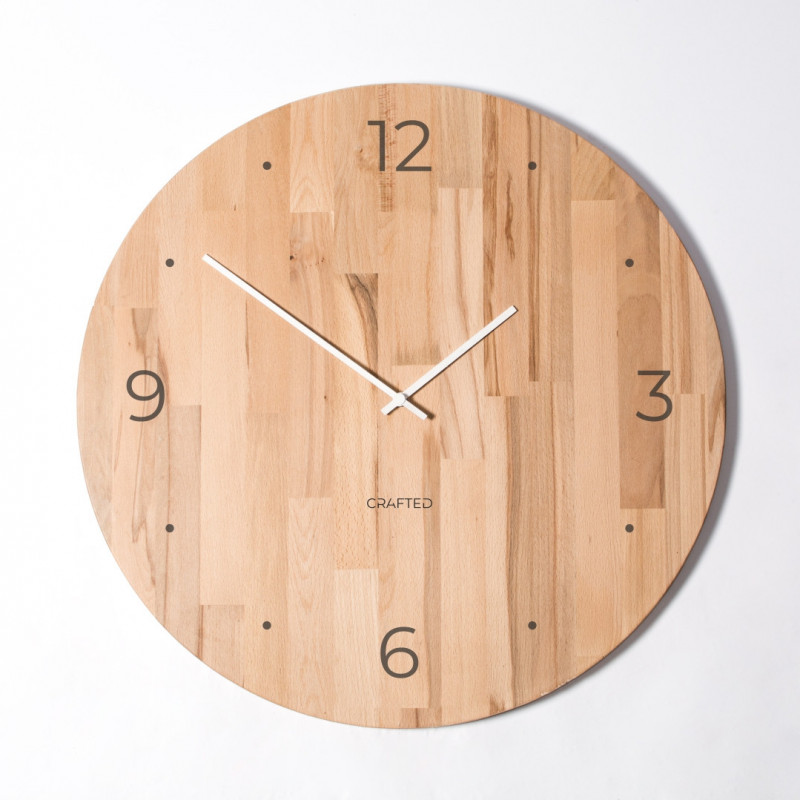 Dřevěné hodiny z bukového dřeva mají průměr 60 cm. Hodiny mají bílé ručičky ukazující čas a pálený ciferník je velice přehledný – číslice 12, 3, 6 a 9 jsou vypáleny a mezi nimi jsou tečky, které nahrazují číslice.