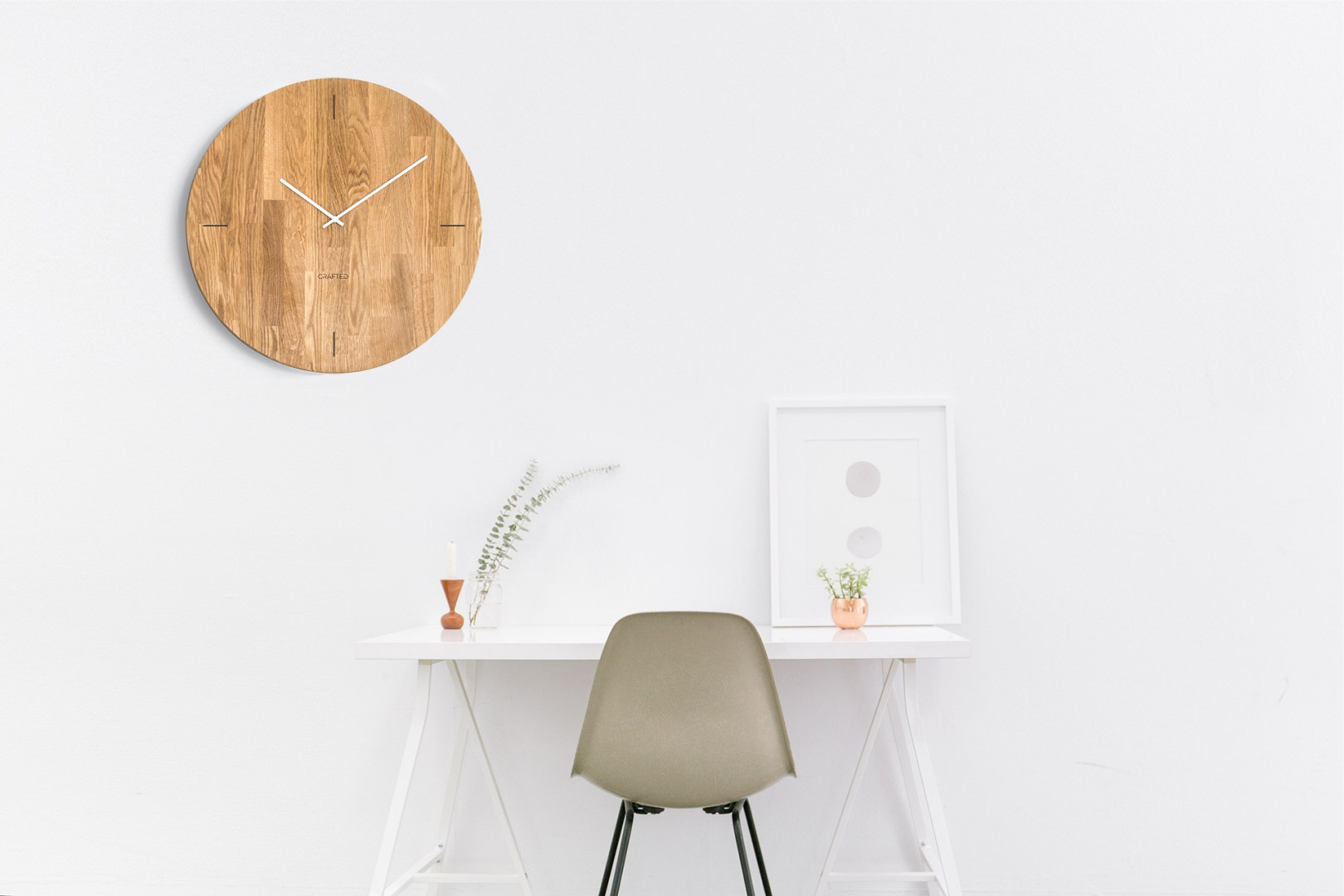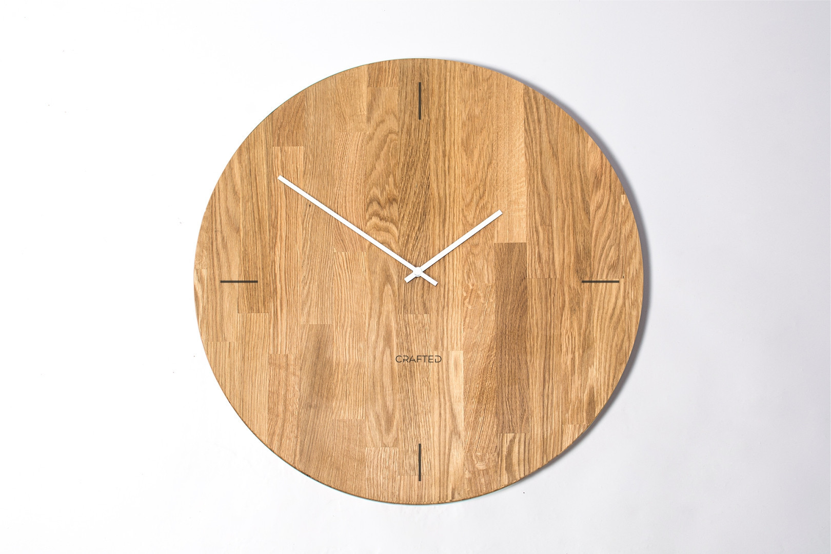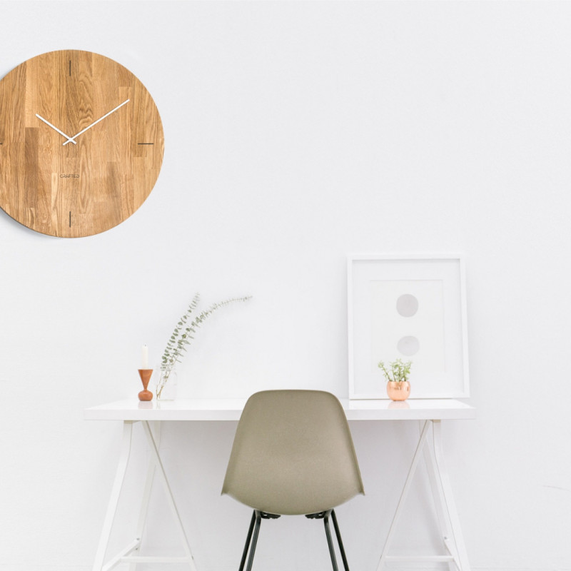 Dřevěné hodiny z dubového dřeva mají průměr 60 cm. Mají gravírovaný ciferník minimalistického stylu v podobě čtyř černých čar a bílé ručičky, hodiny tak umožňují rychlou orientaci v čase. Svým jednoduchým vzhledem budou moderním a vkusným doplňkem vašeho interiéru.