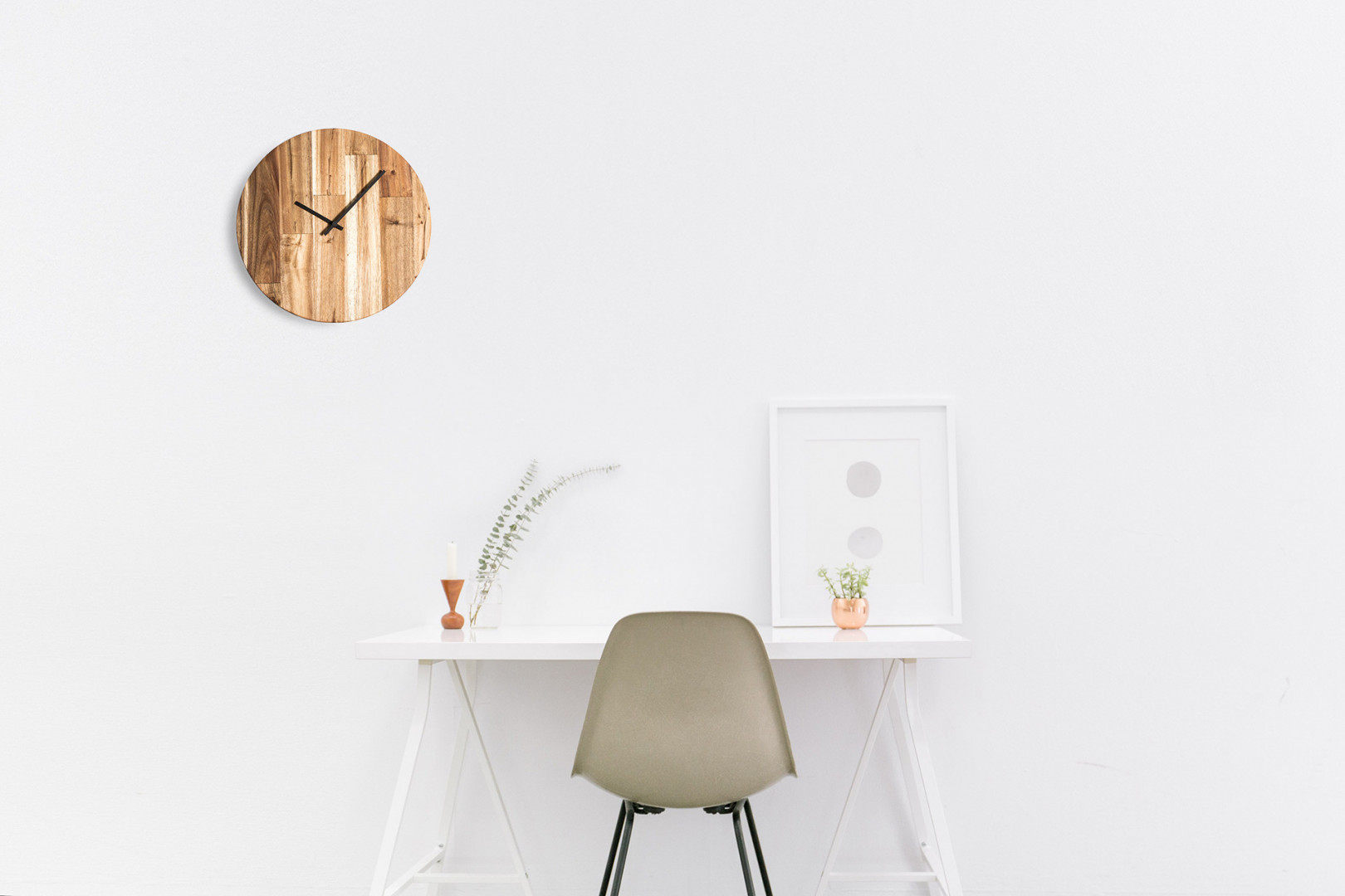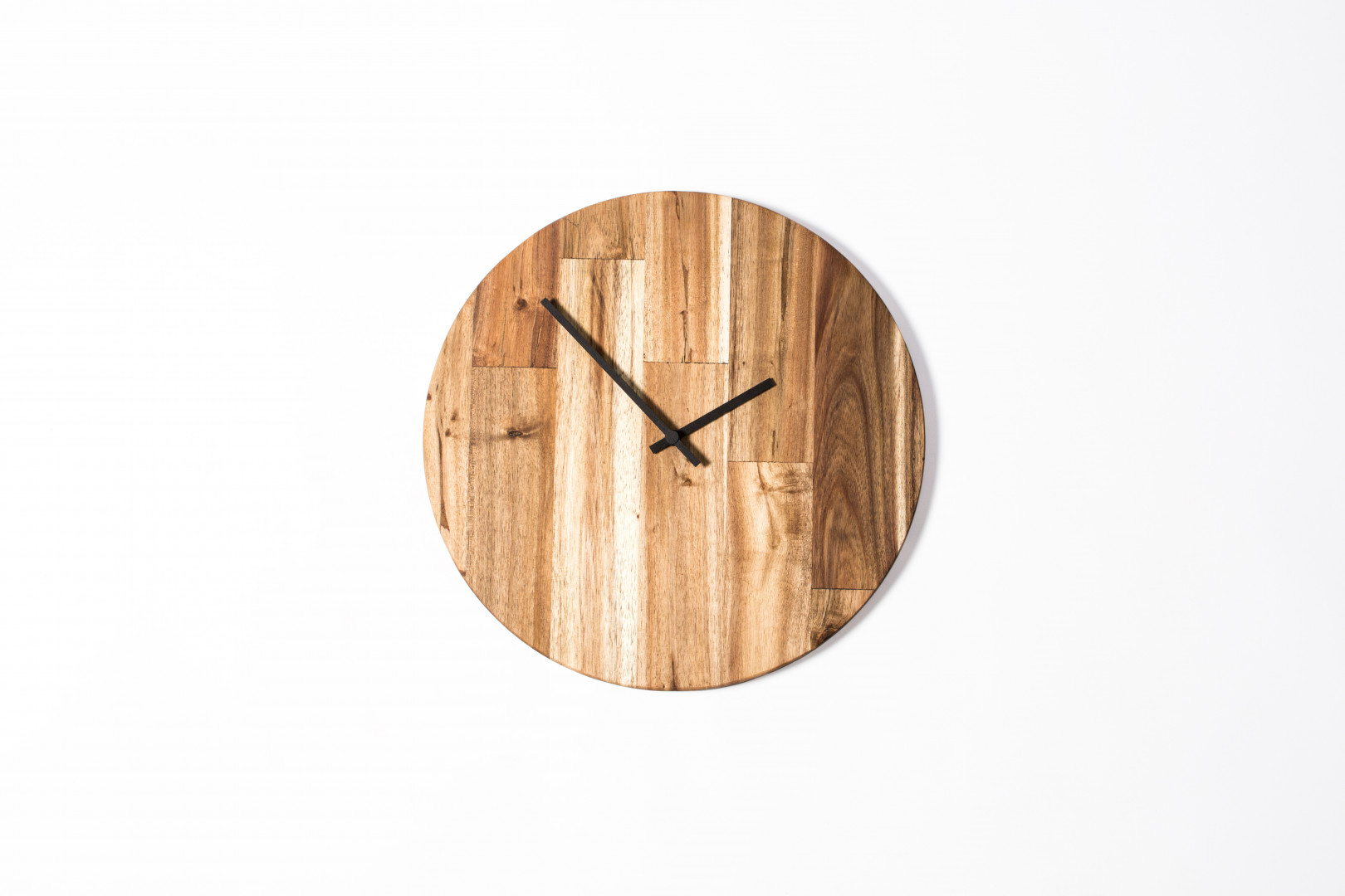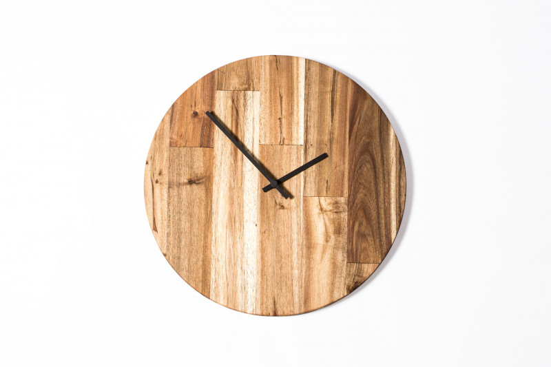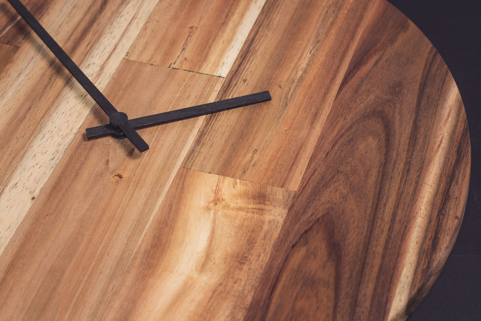 Nástěnné hodiny Pure M jsou vyrobeny z akátového dřeva.