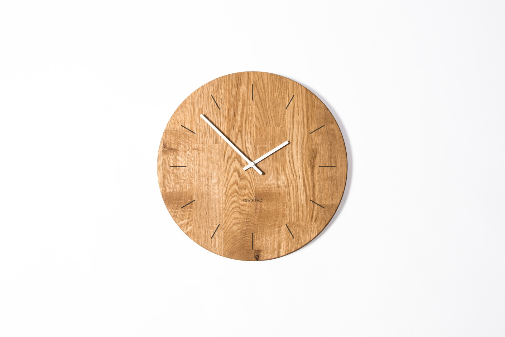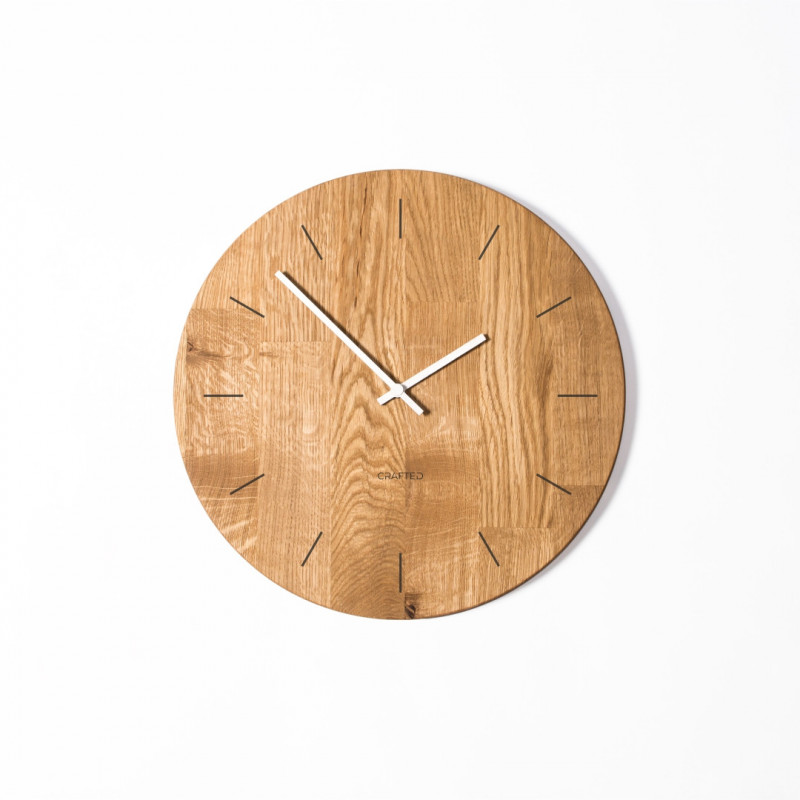 Dřevěné hodiny z dubového dřeva o průměru 40 cm. Hodiny mají bílé ručičky a ciferník, který je vygravírovaný v podobě dvanácti krátkých čar nahrazujících číslice. Hodiny tak poskytují rychlý přehled o čase.