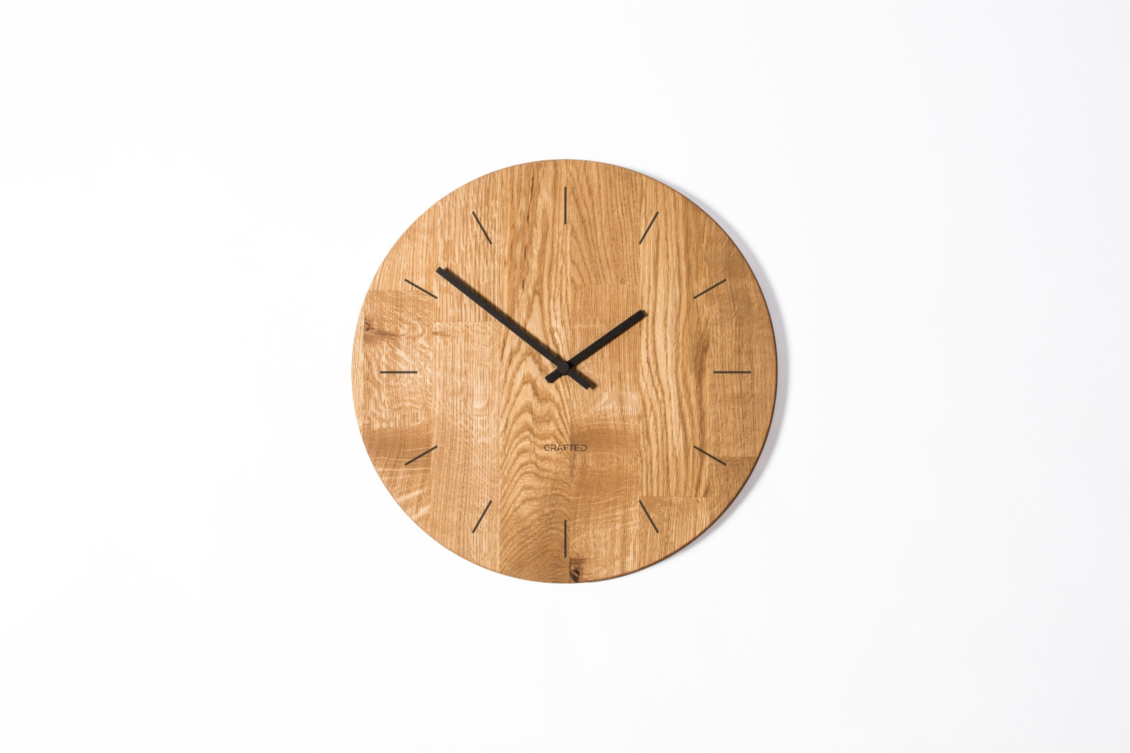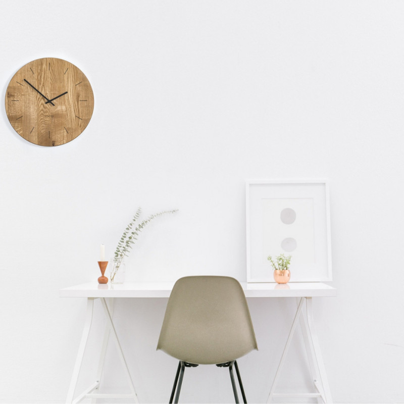Dřevěné hodiny z dubového dřeva o průměru 40 cm. Hodiny mají černé ručičky a ciferník, který je vygravírovaný v podobě dvanácti krátkých čar nahrazujících číslice. Hodiny tak poskytují rychlý přehled o čase. Svým jednoduchým vzhledem budou moderním a vkusným doplňkem vašeho interiéru.