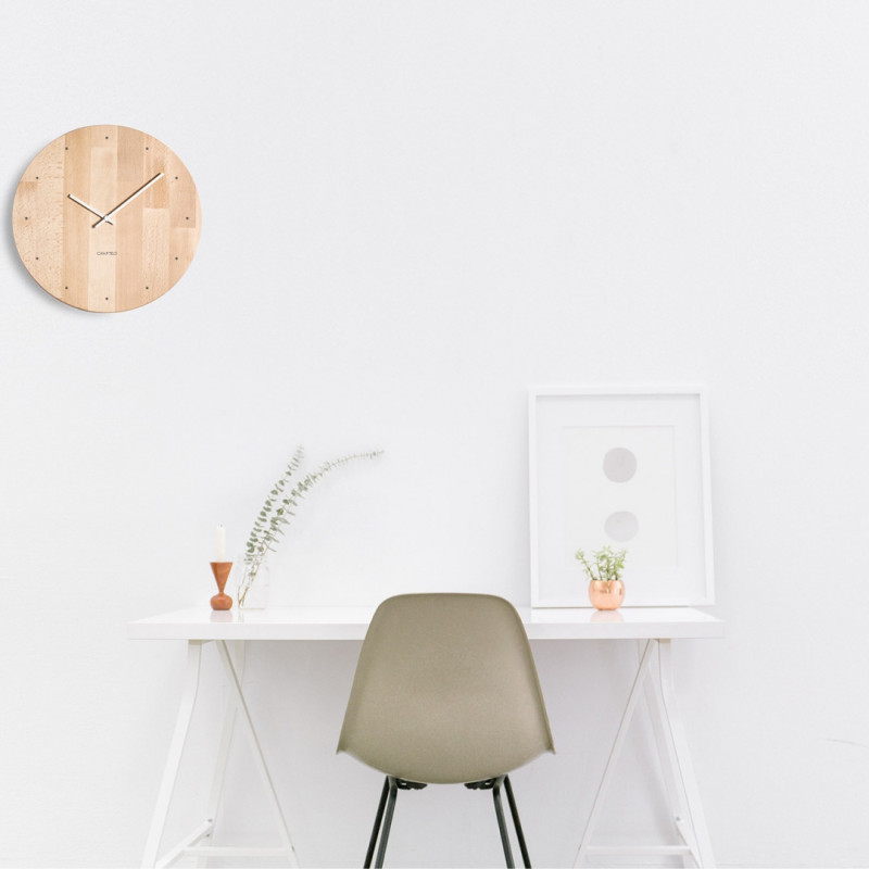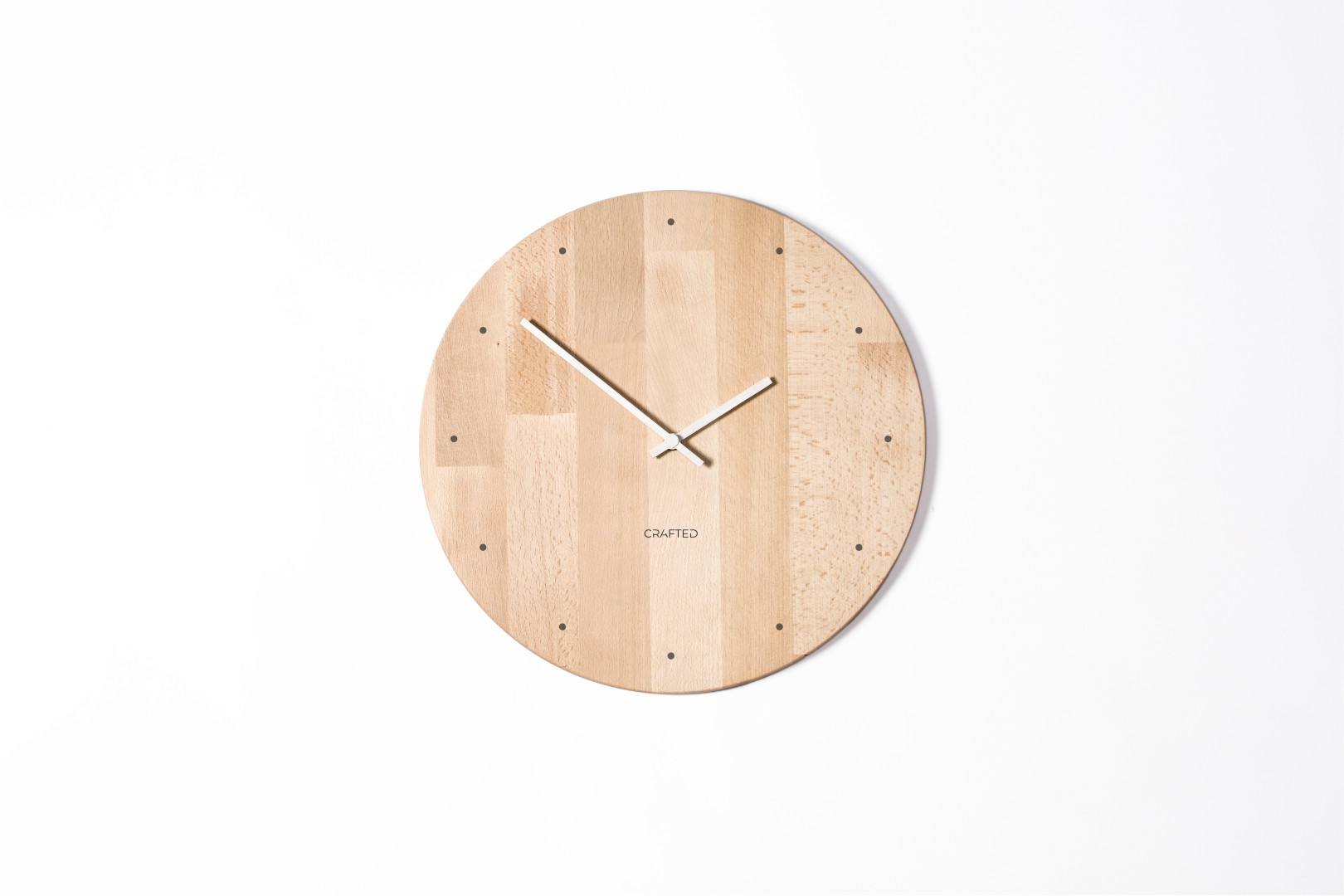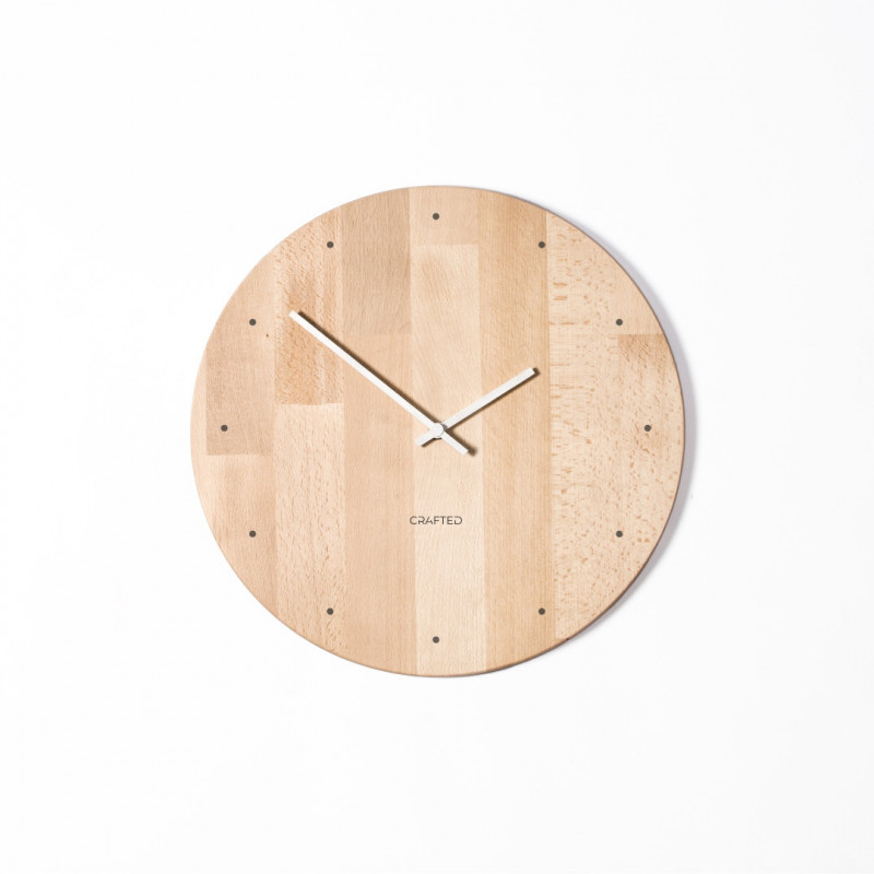 Dřevěné hodiny z bukového dřeva o průměru 40 cm. Hodiny mají bílé ručičky a ciferník je gravírovaný a tvoří jej dvanáct černých teček, které nahrazují číslice.