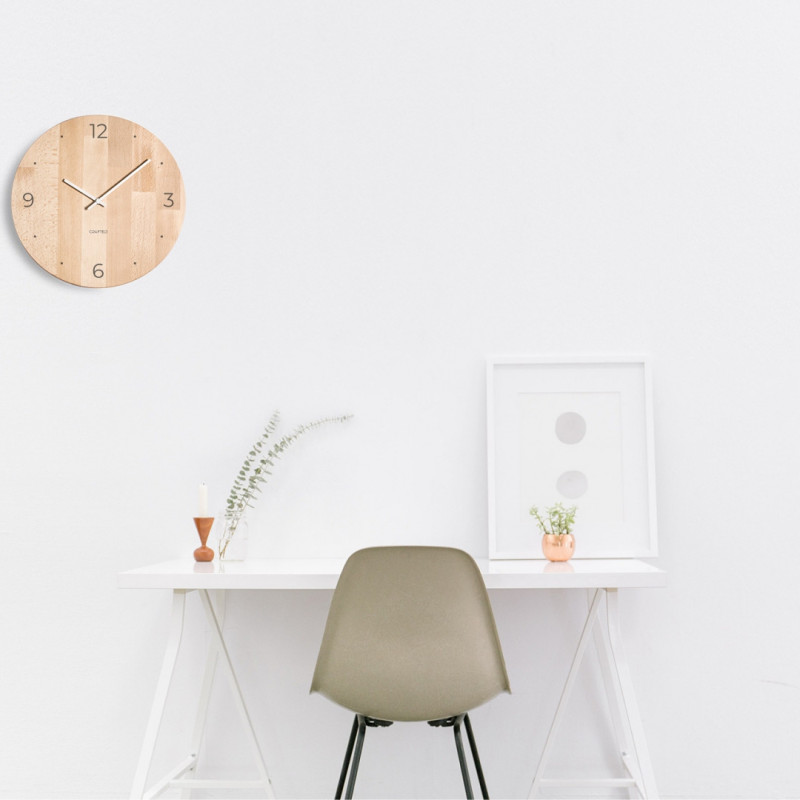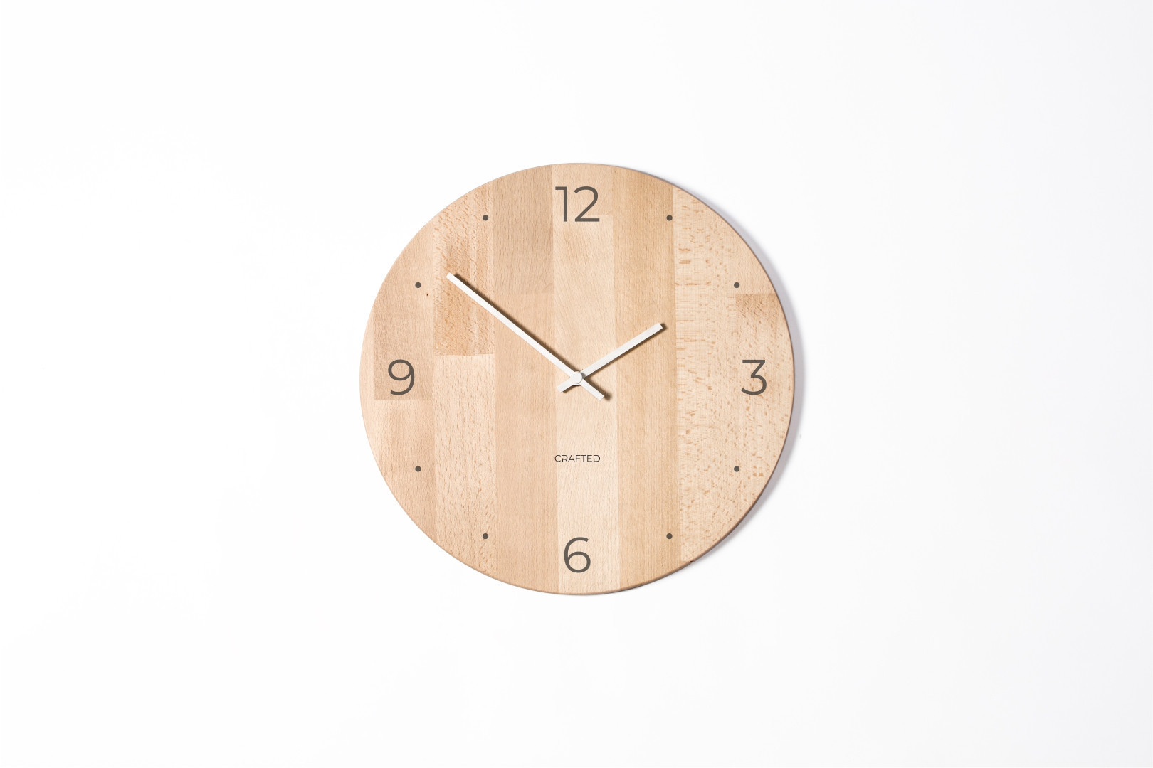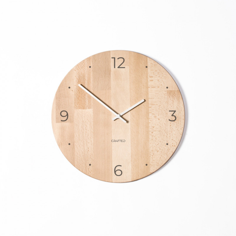 Dřevěné hodiny z bukového dřeva o průměru 40 cm. Hodiny mají bílé ručičky ukazující čas a ciferník je velice přehledný – číslice 12, 3, 6 a 9 jsou vypáleny a mezi nimi jsou tečky, které nahrazují číslice.