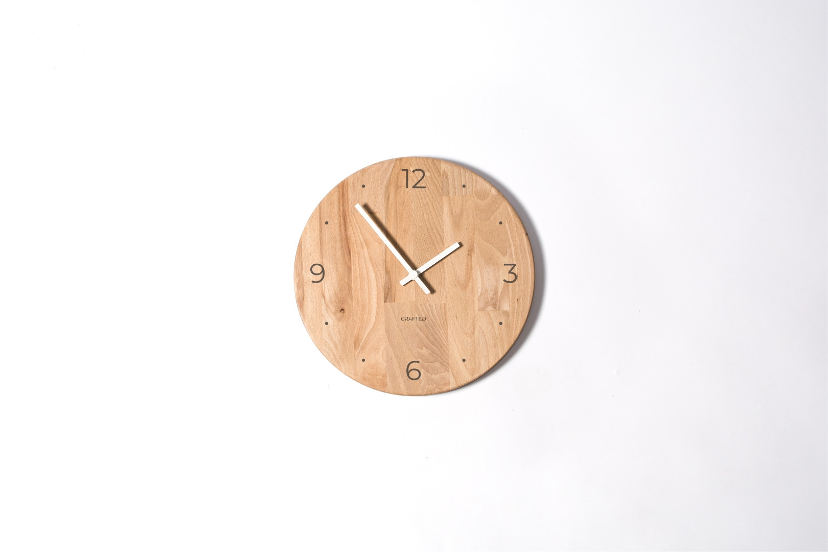 Dřevěné hodiny z bukového dřeva o průměru 30 cm. Hodiny mají bílé ručičky ukazující čas a pálený ciferník je velice přehledný – číslice 12, 3, 6 a 9 jsou vypáleny a mezi nimi jsou tečky, které nahrazují číslice.