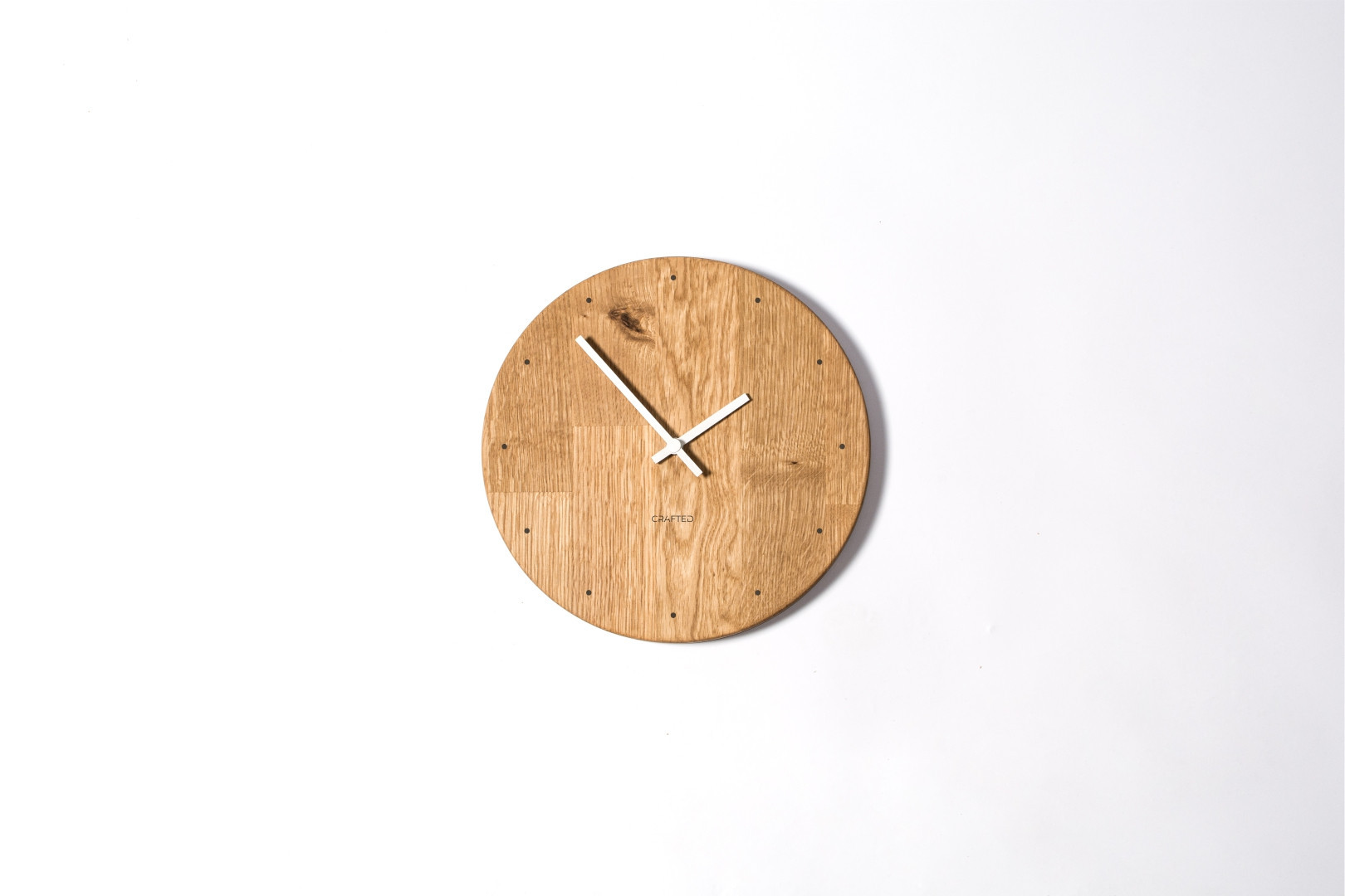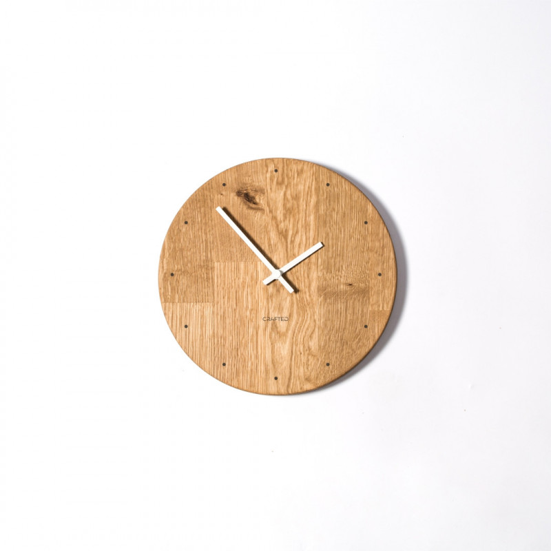 Dřevěné hodiny z dubového dřeva o průměru 30 cm. Hodiny mají bílé ručičky a ciferník je gravírovaný a tvoří jej dvanáct černých teček, které nahrazují číslice. Svým jednoduchým vzhledem budou moderním a vkusným doplňkem vašeho interiéru.