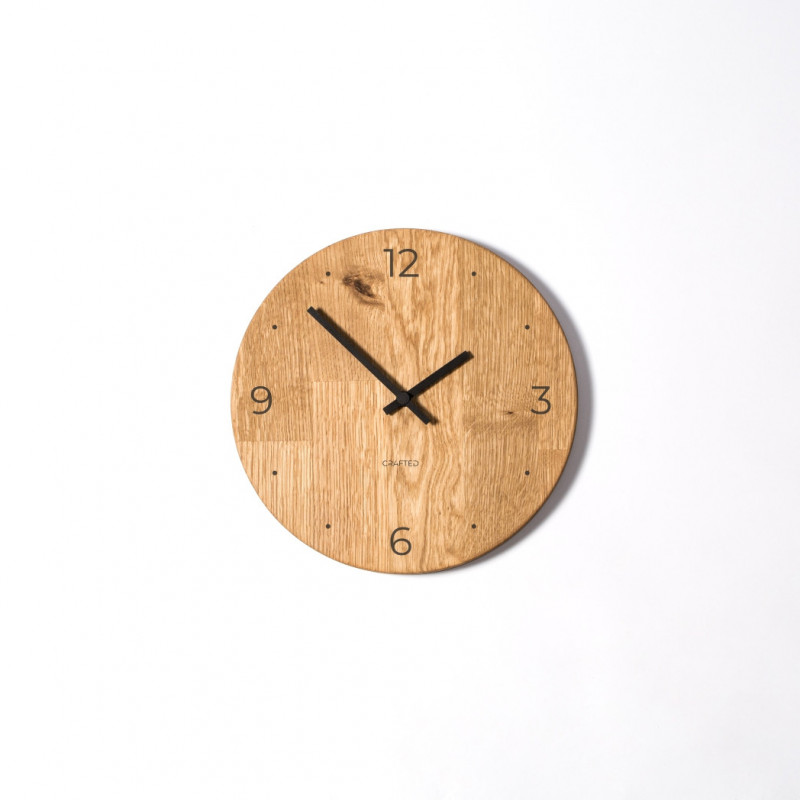 Dřevěné hodiny z dubového dřeva o průměru 30 cm. Hodiny mají černé ručičky ukazující čas a pálený ciferník je velice přehledný – číslice 12, 3, 6 a 9 jsou vypáleny a mezi nimi jsou tečky, které nahrazují číslice.