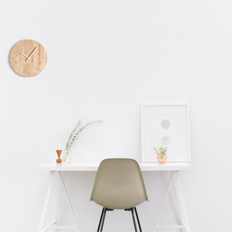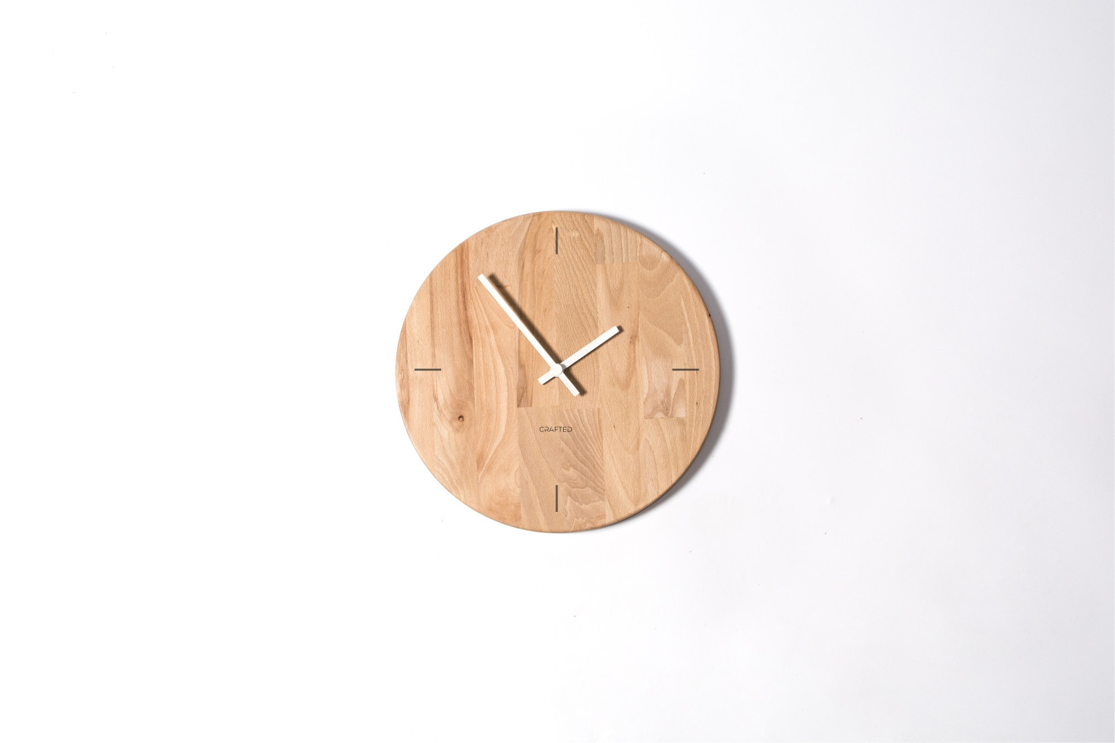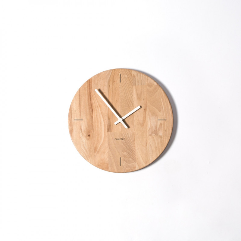 Dřevěné hodiny z bukového dřeva o průměru 30 cm. Mají gravírovaný ciferník minimalistického stylu v podobě čtyř černých čar a bílé ručičky, hodiny tak umožňují rychlou orientaci v čase.