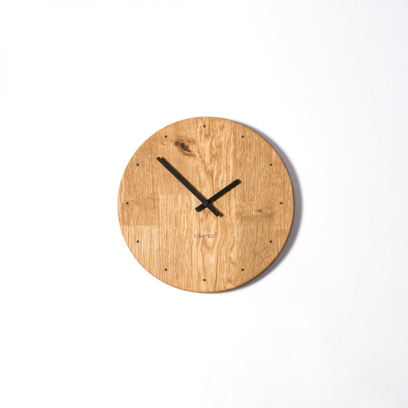 Dřevěné hodiny z dubového dřeva o průměru 30 cm. Hodiny mají černé ručičky a ciferník je gravírovaný a tvoří jej dvanáct černých teček, které nahrazují číslice. Svým jednoduchým vzhledem budou moderním a vkusným doplňkem vašeho interiéru.