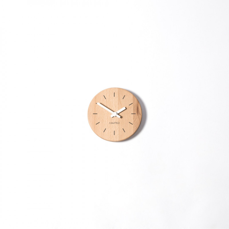 Dřevěné hodiny z bukového dřeva mají průměr 15 cm. Hodiny mají bílé ručičky a ciferník, který je vygravírovaný v podobě dvanácti krátkých čar nahrazujících číslice. Hodiny tak poskytují rychlý přehled o čase.